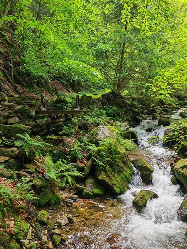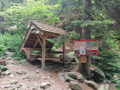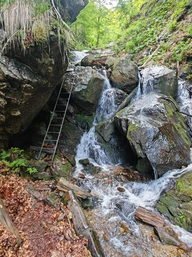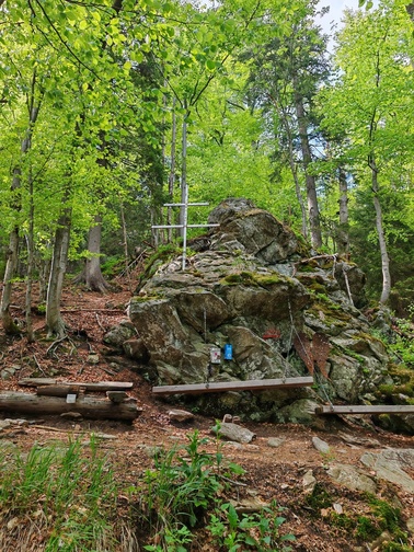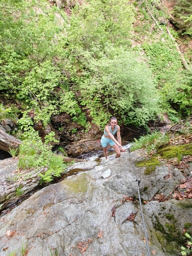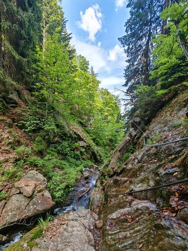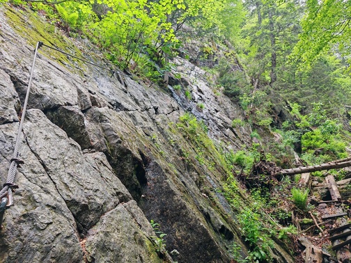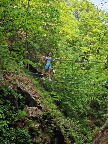 Následne pokračujete po spoločnom "lane" až ku križovatke, kde sa ferrata rozdeľuje na kratšiu = strmšiu alebo dlhšiu=jednoduchšiu. My sme si vybrali dlhšiu trasu (po ľavej ruke) ktorá nám trvala asi ďalších 30 minút pomerne náročného lezeckého výkonu. Následne sme prišli na normálny lesný chodník kde sme prechádzali okolo pamätníka, kde je príjemné miesto na občerstvenie.
